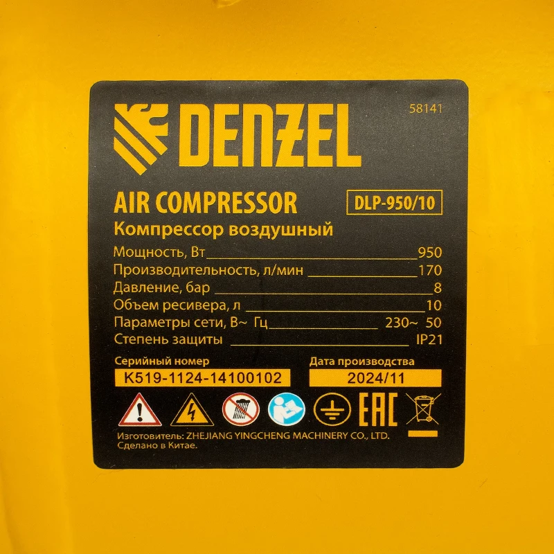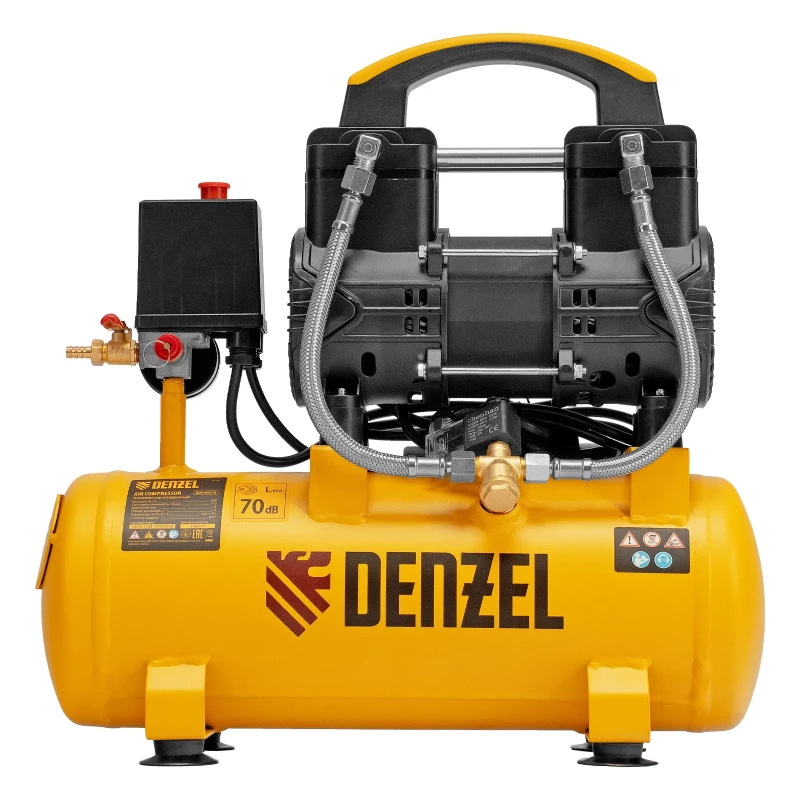 - Наименование Компрессор безмасл. малошумный DLP-950/10, 950Вт,10 л, 2850 об/мин, 170 л/мин Denzel