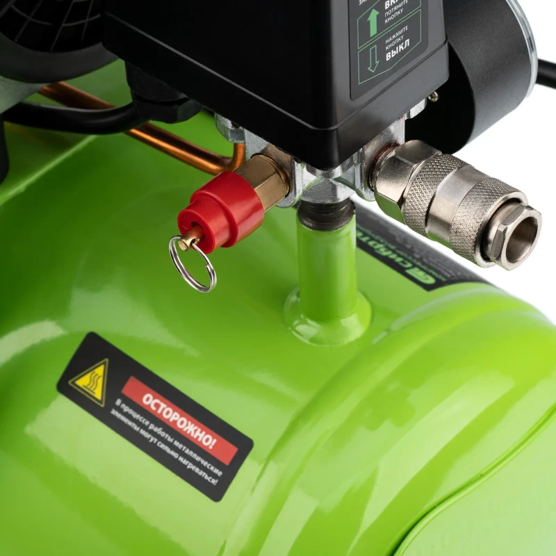 - Контроль рабочих параметров — компрессор оборудован механическим манометром для отслеживания давления.