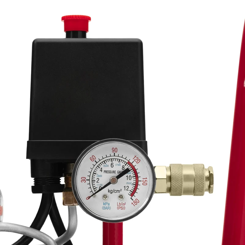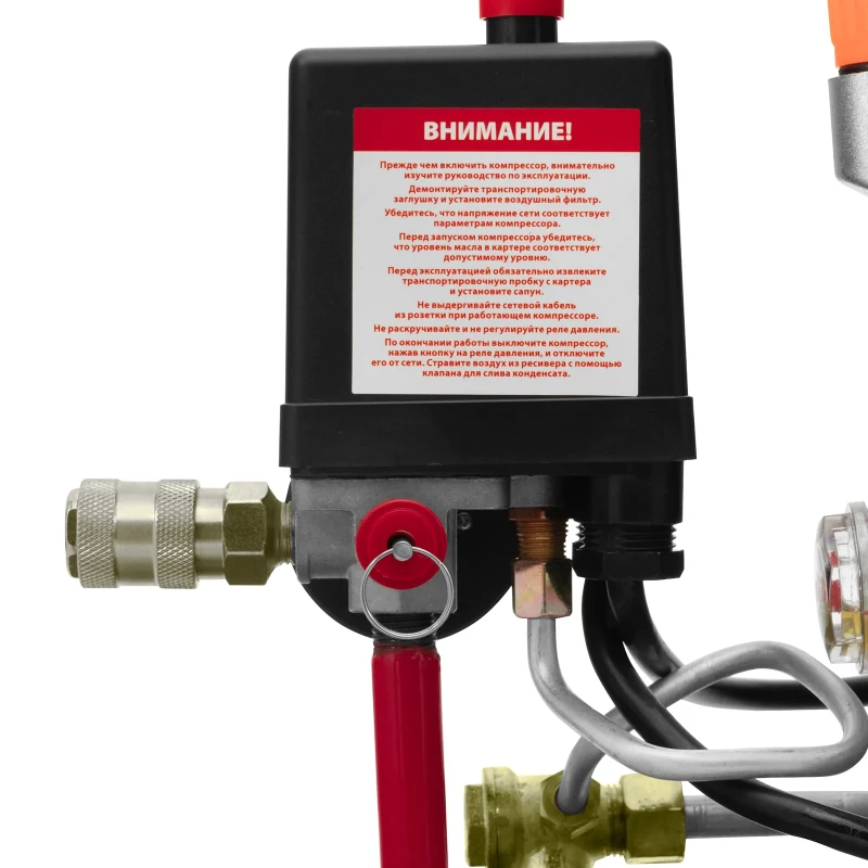 Автоматическая регулировка производительности — прессостат останавливает двигатель при достижении максимального рабочего давления (8 бар) и запускает его при падении давления ниже 5,5 бар.