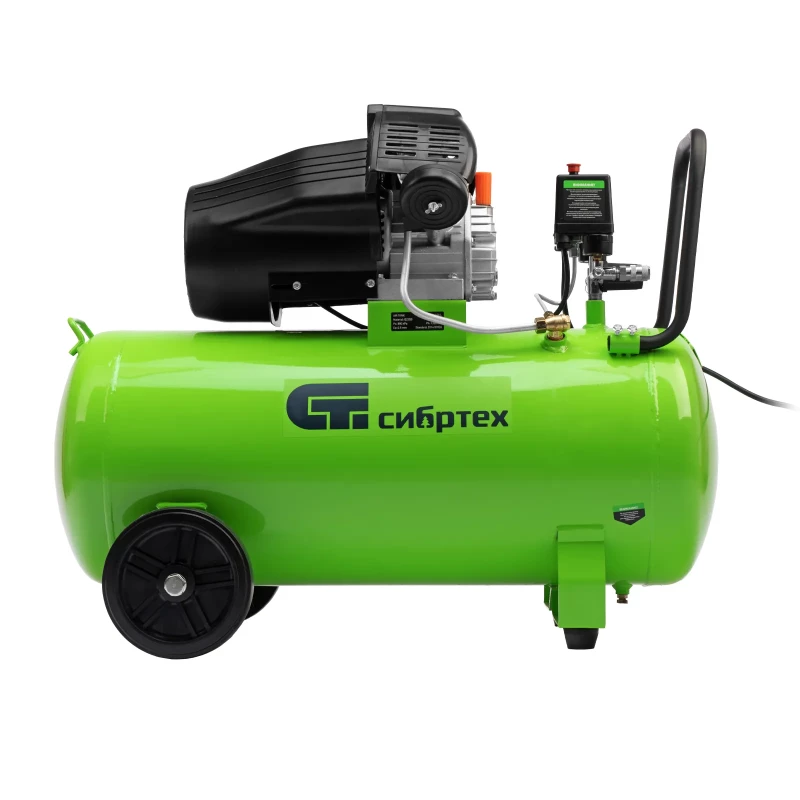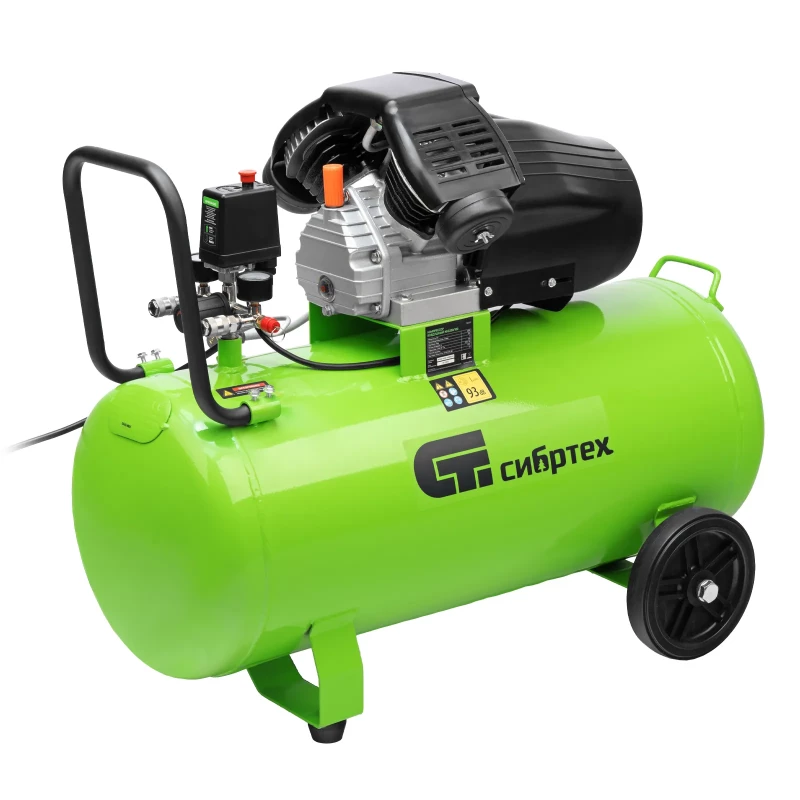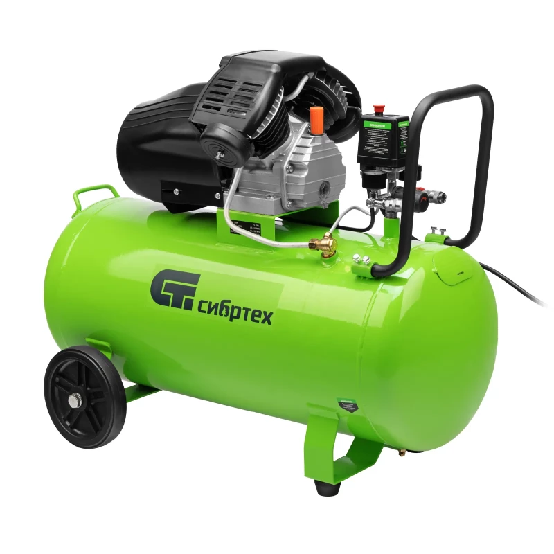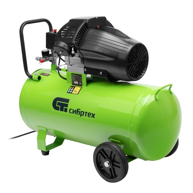 - Компрессор воздушный масляный Сибртех КК-2200/100 58009 мощностью 2,2 кВт, с объемом всасываемого воздуха 350 л/мин, с прямым приводом, оборудован ресивером на 100 л
