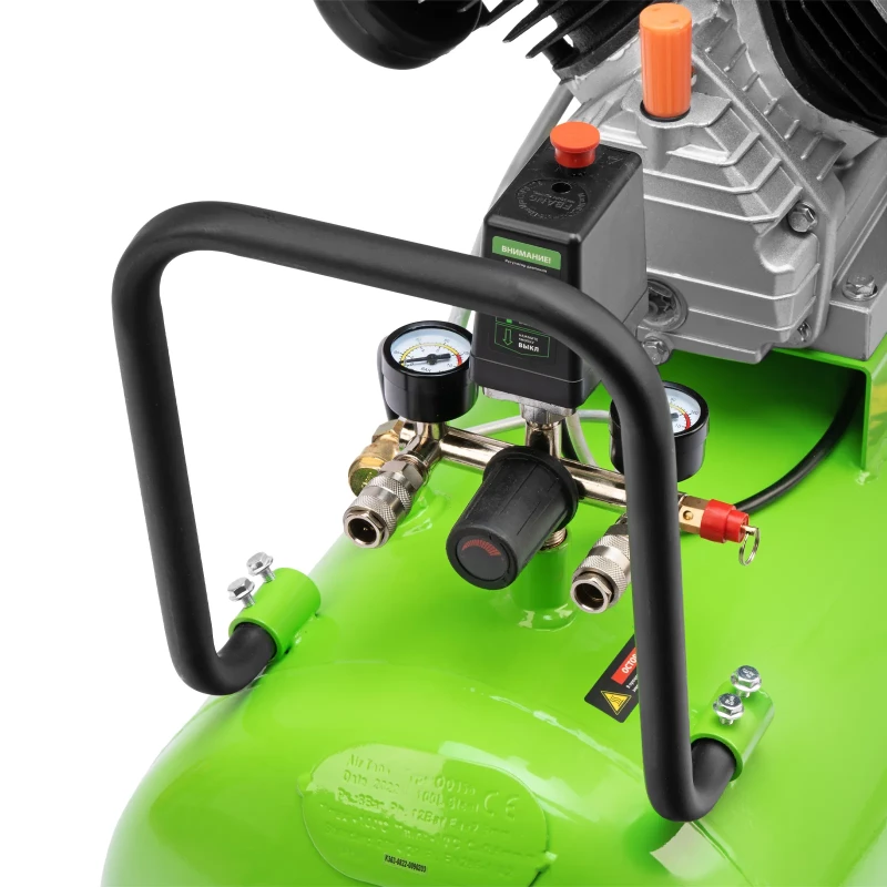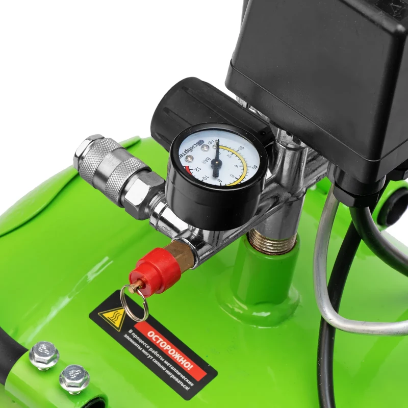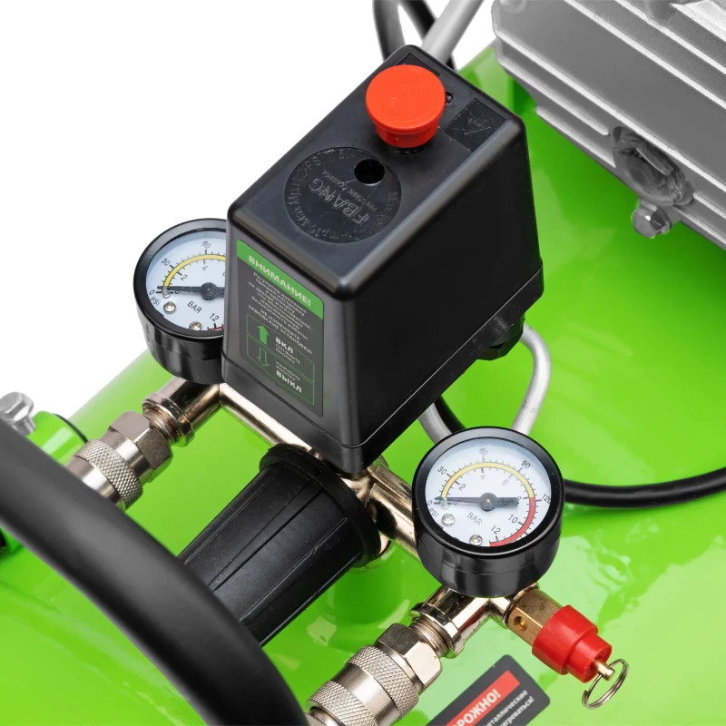 - Контроль давления в ресивере и выходной магистрали — компрессор оборудован 2 манометрами, расположенными максимально удобно для считывания показателей